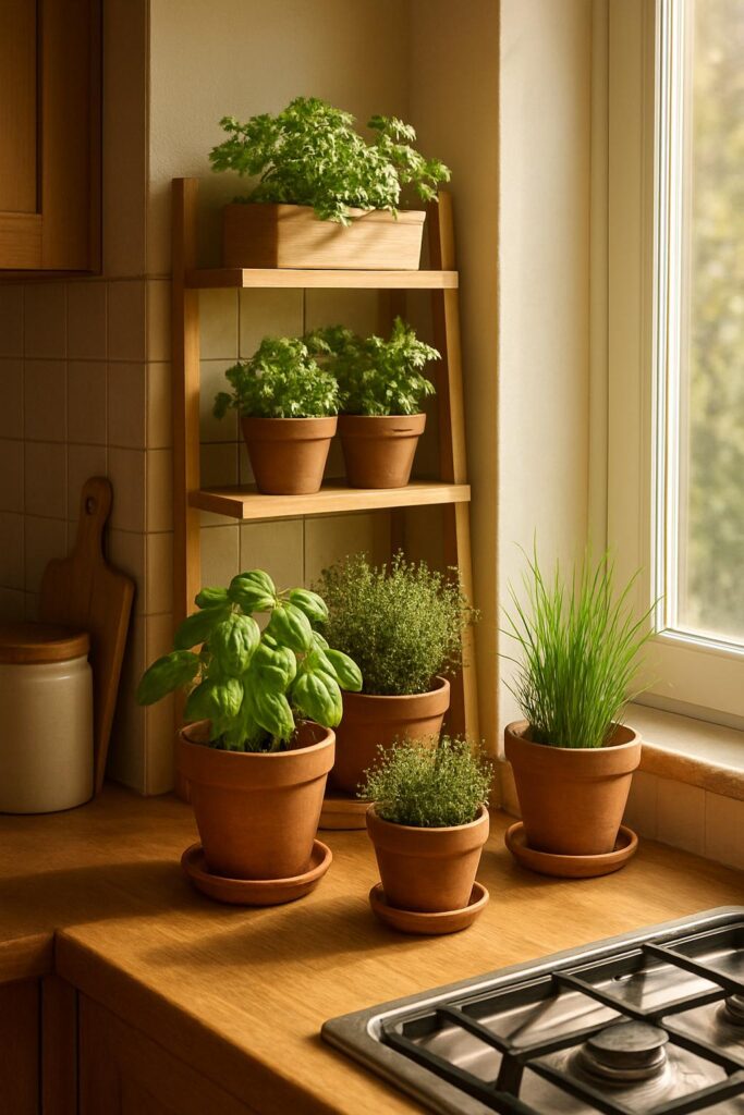 This setup creates a rustic and tidy look while keeping fresh herbs within easy reach. It is ideal for indoor gardening and works well in apartments with limited space.